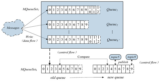 The Queue Controller module classifies the messages. Then the Message_bus module uses the publish/subscribe mechanism and message queue for message delivery. Thus, message queues can be set up: the elements in the MQueueSetk queue set is combined with the message queues, and the messages in the queue are the smallest non-subdivided units. The messages are sorted by the value of priority to multiple MQ collections and, finally, a new MQueueSetk {MQ1, MQ2, MQ3, …, MQi} is generated. The real-time messages are processed efficiently by the combination of Broker, Topic, Producer, and Consumer components.