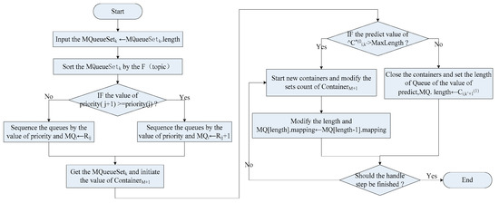 Define Mi = <IDM, UserM, ContentM, Priority>, where IDM (ID of the Message) is the message number, UserM is the owner of message, ContentM represents the content of message, and Priority represents the priority of yjr message. Messages are dispatched and a number of message queues are created according to the content of messages. Then, ContentM and topic are compared by fuzzy matching to build the mappings. Messages with the same value of ContentM are mapped with containers, so the elastic management for containers is achieved based on message scheduling. MQ = {MSG, Map, Max} represents the message queue, MSG (Message Set Group) represents the queue set, Map represents the map value, and Max represents the queue length threshold. MQ (Message Queue) represents a set of queues defined as: MQueueSetk{MQ1, MQ2, MQ3, …, MQi}, where the range of k is in [2, k − 1].