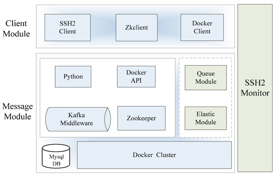 Various states and the information of containers are stored in system database monitored by the Docker API (Application Program Interface). The containers are used as the message processing part of the prototype system, and the Docker daemon is used to operate the entire Docker cluster. Queue Module is controlled by the implementation of the algorithm that completes the message processing, classification, and mapping operations. The Elastic module is used to achieve elastic expansion of container cluster by creating the mappings.