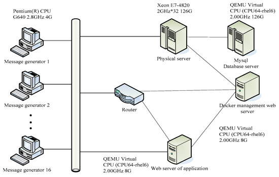 The effect of elastic scalability for cloud containers has been evaluated from multi-aspect experiments. Twenty PC servers are used as the message generator, database servers, and Docker manager servers to build an experimental environment. An E-shop system was chosen as the application test case. The E-shop system is based on the benchmark program of TPC-W (Transaction Processing Performance Council for Web), and Pylot software (V 1.26, Apache Software Foundation, Forest Hill, MA, USA) as the message generator to generate high concurrent load. The E-shop system consists of several modules according to the micro-service framework, such as a shopping service, a logistics service, a transportation business service, a car service, and a business pay service. The configuration of the testing environment of the experiments is shown in Figure 6.