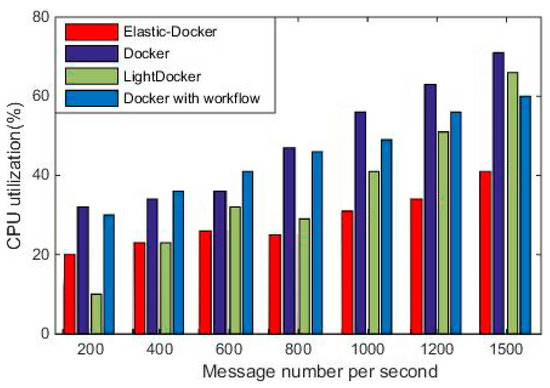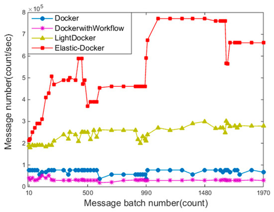 Experiment one evaluates the throughput of messages in four different ways. The reasons for their changes are tracked and analyzed by observing changes in the amount of messages sent in different ways. There are concurrent messages (the size of batch message is from 20 to 2000) to verify the effectiveness of message queue processing strategy. A single message is sent (every 200 bytes) as the experimental base, experimental data of the message number produced per second are recorded. According to Figure 7, we can see the comparison data of LightDocker (Red Hat Enterprise Linux 7 Atomic Host, Red Hat Inc., Raleigh, NC, USA), Docker (V 1.13, dotCloud, Inc., San Franciso, CA, USA), Docker with Workflow(An prototype system developed in [5]), and Elastic-Docker systems. Figure 8 shows the average experimental results of throughput in the environment.