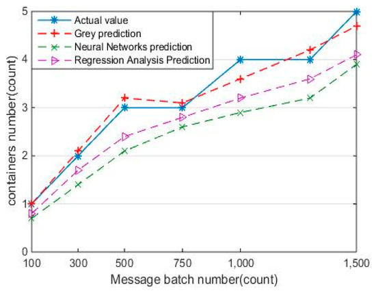 In Experiment 2, the changes of the message processing delay and the accuracy of the predictive value are compared in four ways to verify the validity of the elastic expansion ability. In order to test the accuracy of the container demand prediction method, different numbers of messages are selected (the size of batch message is from 100 to 1500).