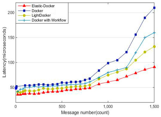 Elastic-Docker still maintains a low delay when the number of batch messages is 2000, and the throughput improves by 90%. Docker with Workflow curve in Figure 8 shows that the adoption of workflow mechanisms in Docker does significantly improve service efficiency, but when a large number of messages come into the system, the improvement of performance becomes inconspicuous and short. As mentioned above, Elastic-Docker effectively improved the message throughput.