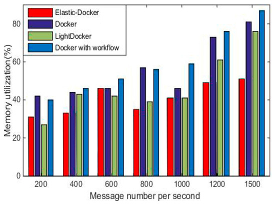 Figure 11 and Figure 12 show that CPU consumption and memory consumption of the four systems increase with the increase of the number of messages. With the increase of workload, the consumption of CPU and memory under the four kinds of system increase gradually. The Elastic-Docker is less expensive than the other three methods in terms of CPU and memory consumption when the number of message reaches 1500/s. Due to the accurate message scheduling for container clusters, Elastic-Docker is significantly lower than the other three systems in terms of resource consumption when faced with a message volume of 1500/s. This experiment shows the advantages of Elastic-Docker resource consumption, obviously.