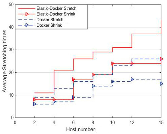 Experiment 4 compares the elastic scalability of Elastic-Docker with original Docker. The times of containers that can be stretched in a high concurrent environment is an important indicator to measure the flexibility under the same cluster size of hosts. In this paper, the scenarios of workload changes are frequently selected as the experimental environment. The average time of stretching and shrinking of the two systems is counted in several experiments, as shown in Figure 13.