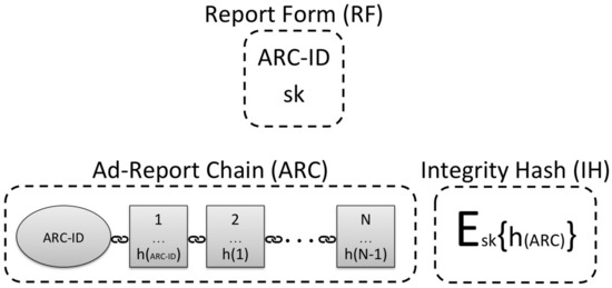 As shown in Figure 4, the first block of the ARC contains an initiating value which is marked as ARC-ID. This is hashed to produce that is included in the second block with each consecutive block following the same arrangement. The essentially works as a unique identifier which also marks the start of a specific ARC. The ARC-ID is dictated by the Broker and sent to the user within the (Report Form) as depicted in the same figure. Recall from Section 4.1 that the RF (Report Form) is a message that comes as a response to the user’s request to file Ad-Reports.