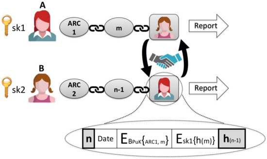 Figure 8 illustrates an example where two users A and B have added each others’ Affiliation Blocks within their respective ARCs. The AB which was added by user B, is shown in the diagram to contain a new sequence number n, the hash of the previous block , the Date of the meeting (as registered by B) and the information that was sent by A which includes her ARC-ID=ARC1 as well as the sequence number m and digest of her last block. The date which is added by B works as a T-Token which verifies the last block of ARC1 at a particular time. Notice that ARC1 and sequence number m are sent encrypted with the Broker’s public key while the is signed with A’s signing key sk1 which is also used for the creation of the Integrity Hash IH as explained in Section 5.1.2. This ensures that B does not lean any information about ARC1 and is not able to alter .