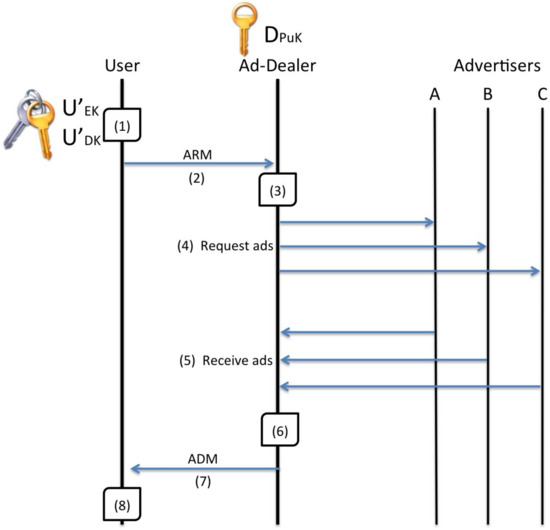 - The responding Ad-Dealer decrypts the ARM with the corresponding key which is kept private among all the Ad-Dealers who use the system and obtains as well as the user’s advertising interest.