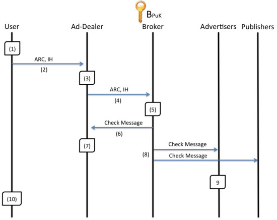 - The user gradually composes his or her reports into an ARC as he or she is interacting with adverts. The contents of the ARC are encrypted with the Broker’s public key except for the first block that contains the ARC-ID and the sequence number N and hash digest in all remaining blocks. When the ARC is ready for submission, the user produces an Integrity Hash IH by computing and signing the result with the signing key sk which were delivered to him with the sub-protocol described in Section 5.3.1.