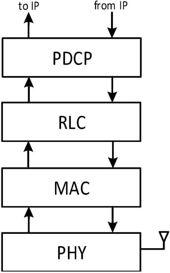 LTE-A (Long-Term Evolution-Advanced) protocol stack. IP: Internet Protocol; PDCP: Packet Data Convergence Protocol; RLC: Radio Link Control; MAC: Media Access Control; PHY: physical.
