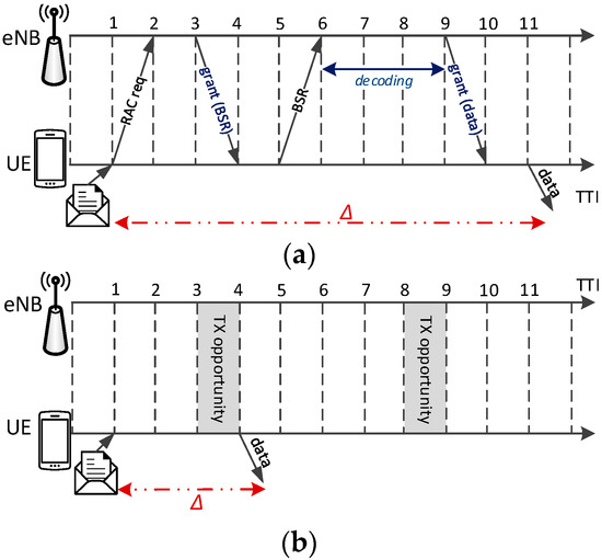 (a) Scheduled Resource Allocation (SRA); (b) Autonomous Resource Selection (ARS). is the time between the generation of new data and the actual transmission. UE: User Equipment; eNB: eNodeB; RAC: Random ACcess; BSR: Buffer Status Report; TTI: Transmission Time Interval; TX: transmission.
