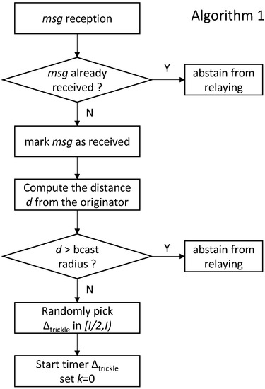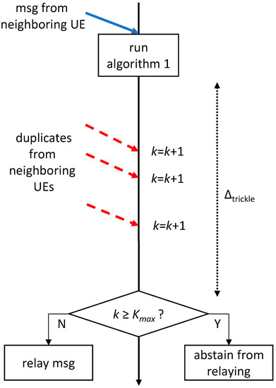 UE applications should also take care of relaying. In fact, it is at the application level that suitable algorithms can be run to make relaying efficient. A brute-force relaying, whereby UEs relay all received messages, would in fact quickly congest the network, since the same UE would receive the message from several neighbors, and relay them all unnecessarily. This would waste resources that could otherwise be used for other purposes. In order to make relaying efficient, a suppression mechanism can be used, e.g., the one of the Trickle algorithm [31]. Trickle is used in WSNs to regulate the relaying of updates and/or routing information. In that context, Trickle runs on each node participating in the broadcasting: before sending a message, the node listens to the shared medium in order to figure out if that information is redundant, i.e., enough neighboring nodes are already sharing it. If so, it abstains from transmission so as to avoid network flooding. In Trickle, two parameters can be configured: the Trickle Interval I and a number of duplicates . A UE selects a random time window in , and counts the copies of the same message received therein. The UE only relays a message if it receives fewer than copies of it. To sum up, Figure 4 depicts the flowchart of the operations performed by a UE application on reception of a message, when the Trickle suppression algorithm is employed. First, the UE checks whether the incoming message had already been received. If so, it abstains from relaying and the procedure terminates. Otherwise, it computes the distance from the originating UE and compares it with the maximum target radius. If the UE is inside the target area, then Trickle operations are initiated: the Trickle timer is started and the duplicate counter k is set to 0. Figure 5 shows that k increases on each duplicate reception within . When the above timer expires, the UE relays the message if .