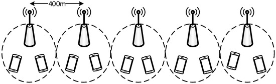 Our first simulation scenario, shown in Figure 8, includes five adjacent eNBs, located at a distance of 400 m from each other. We initially assume that each eNB serves 30 UEs with P2MP D2D capabilities, which are deployed randomly in a narrow strip along a straight line. UEs are assumed to be static. Their transmission power is 30 dBm in the UL and 15 dBm in the SL. The channel model includes Jakes fading and log-normal shadowing. Table 1 reports physical-layer parameters. We assume that broadcast messages transport a 4 byte payload, representing a code for indicating the type of the message. Considering the additional information for the originator’s coordinates and the target radius discussed in Section 4, we assume a total length of 14 bytes. A message is generated by a random UE every second, starting a new broadcast. As we will show later, the duration of each broadcast is less than one second, hence we can consider each message dissemination as an independent event. For each configuration, we run one instance of 100 s and statistics are obtained by averaging 100 independent broadcasts. Confidence intervals at the 95% level are shown. In the following, we assume that UEs relay the same message only once and that the target radius is 1000 m, unless otherwise specified.