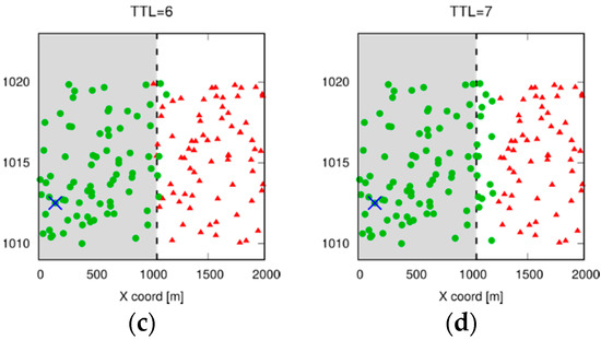 Figure 9 shows which UEs receive a broadcast message, when either TTL or GPS coordinates and radius are used. The UE marked with the cross is the one that originates the message, and the boundary of the target area (i.e., the shaded one) is marked by the vertical dashed line. Note that the line only looks straight because the scale on the y-axis is stretched. UEs that received the message are shown as green circles, whereas red triangles represent UEs that did not. Using coordinates and radius (top left of Figure 9) allows the message to reach all the desired UEs, and few of those outside the range. When TTL is used, the set of UEs depends on the initial TTL value. If the value is set to 5 or 6, some UEs at the border do not receive the message, whereas setting it to 7 covers the entire target area. However, if the line is moved in either direction, or the UE density or the network MCS change, that value stops being optimal and must be recomputed. In order to exemplify the dissemination process of the message, Figure 10 shows the per-TTI allocation of RBs at the eNBs involved in the broadcasting process, which is started by a UE served by eNB1. Thus, the latter allocates RBs to UEs under its control to let them relay the message. After some time, the message reaches UEs served by eNB2 and eNB3, which in turn start granting transmission resources to them. eNB4 and eNB5 do not allocate RBs, since their served UEs are outside the target area.