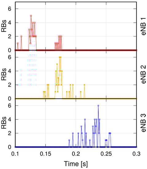 RB (Resource Block) allocation at different eNBs over time.