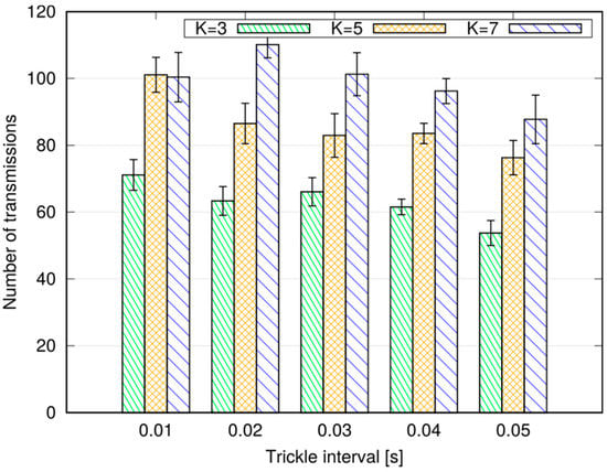 Average number of application-level transmissions with different settings of the Trickle algorithm.