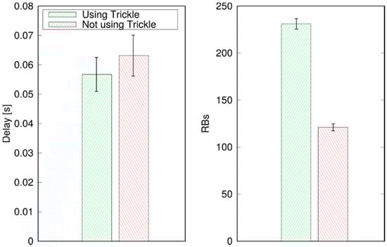 Average delay (left) and average allocated RBs (right), w and w/o Trickle.