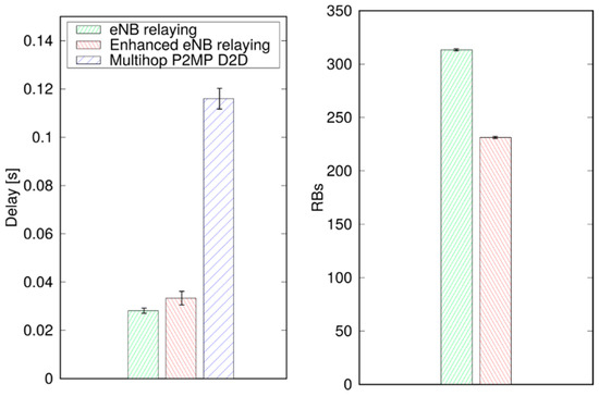 Figure 14 reports the 95th percentile of the delay and the allocated RBs in the DL subframe. As expected, the broadcast is completed sooner using unicast relaying, since UEs can be reached in two radio hops plus, possibly, a (fast) X2 traversal. However, the cost in terms of allocated resources is non-negligible: a broadcasting occupies 230 RBs in the DL subframe, whereas MDB does not require the eNB to use the DL spectrum at all. Note that, in a 10 MHz deployment, using 50 RBs per TTI, unicast relaying would stall the DL for 4–5 consecutive TTIs, which is unadvisable.
