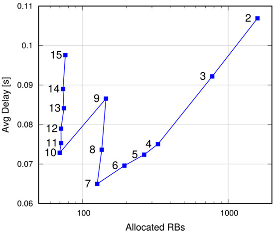 We first discuss the tradeoff involved in the choice of the MCS at the cell level. In Figure 15, the x axis reports the mean of the total number of RBs per broadcast, whereas the y axis shows the mean reception delay of UEs within the target radius. Resources are allocated via SRA, and the points represent the CQIs (which determine the MCS). As expected, the number of allocated RBs decrease with the CQI. In fact, higher CQIs correspond to more performing MCSs, hence to more bits per RB. A message transmission occupies 11 RBs with CQI 3, and one RB with CQI 15. However, using larger CQIs increases the number of hops, hence the latency. This is evident in the two segments 7–9 and 10–15, where the same number of RBs is used, but larger latencies are obtained, since the reception range is reduced. However, latency also increases with too small CQIs. As previously discussed in Section 3, the probability of correct reception decreases with the number of RBs employed, due to frequency-selective fading, all else being equal. The MCS corresponding to CQI 7 strikes a good tradeoff between latency and resource occupancy. While the absolute values in the graph are a function of the target radius, qualitatively similar results (although on different scales on both axes) are obtained when the radius is varied. From now on, CQI 7 is used in the simulations.