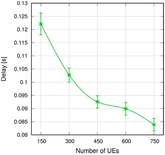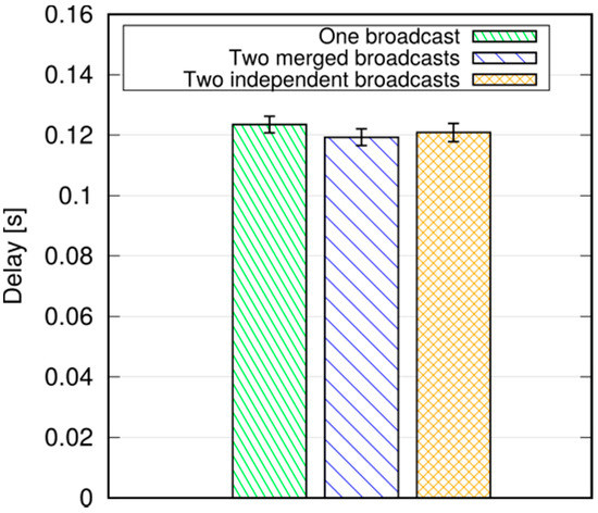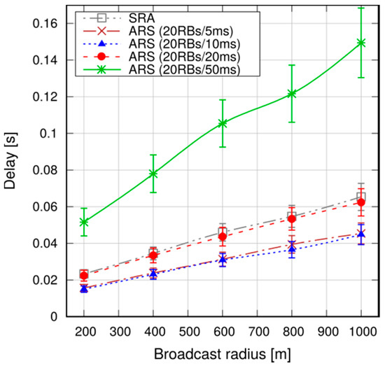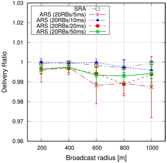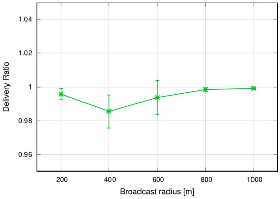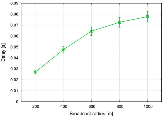 To put the above results into context, we observe that the average broadcast latency with SRA and a radius of 800 m is around 50 ms (see Figure 16), and the corresponding delivery ratio is above 99% (Figure 19). Compared to [25], which addresses broadcasts in an 802.11-based MANET in a somewhat similar scenario (although similarities between such different technologies as 802.11 and LTE are to be taken with a pinch of salt), we note that the latencies are similar, but our delivery ratio is remarkably higher (99% against 90–98%), despite the fact that LTE relies on much smaller UE D2D transmission radiuses (100–150 m against 500 m in [25]).