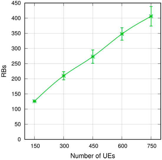 We now assess the performance of MDB in denser networks. We increase the number of UEs served by each eNB from 30 to 150, resulting in a total number of UEs of up to 750. Again, we use a target area with a 1000 m radius. Figure 22 shows the 95th percentile of the delay. We observe that the delay decreases with the UE density, and it is slightly above 80 ms with 750 UEs. This is explained by the larger number of UEs receiving a single broadcast message, hence a larger number of potential relays. This in turn increases the probability of reaching farther UEs. Clearly, more transmissions come at the cost of a higher resource consumption, as reported in Figure 23: the number of allocated RBs per broadcast increase from 130 RBs (with 150 UEs) to about 400 RBs with 750 UEs. Interestingly, the ratio between the allocated RBs and the number of UEs decreases. In fact, more transmissions means more duplicates too, hence more UEs abstain from transmission thanks to the Trickle suppression mechanism.