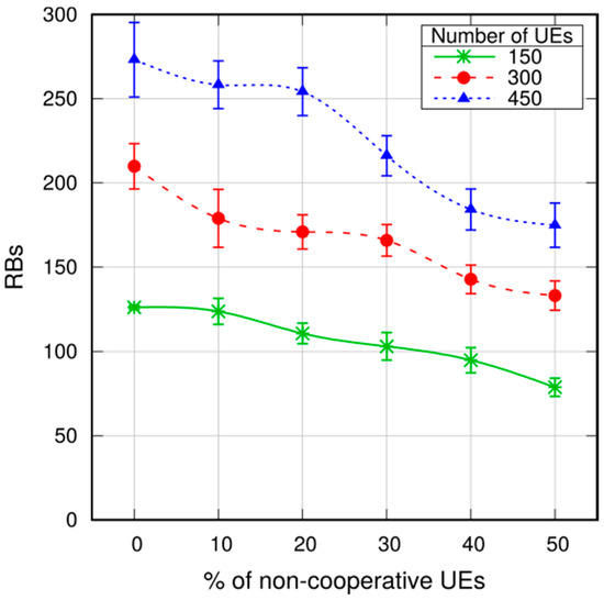 Avg. allocated RBs per broadcast with non-cooperative UEs.