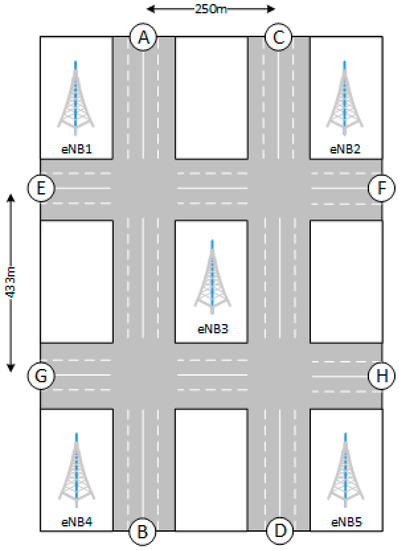 We consider the scenario depicted in Figure 26, which is taken from the 3GPP specifications [41]. The latter describes an urban scenario, defined as a grid of size 250 m × 433 m. Streets have two lanes per direction and each lane is 3.5 m wide. Inter-site distance between eNBs is 500 m. With reference to Figure 26, we defined four bidirectional vehicle flows, respectively connecting points A-B, C-D, E-F and G-H. From each entry point A to H, a new vehicle enters the network each 2.5 s. Vehicles are attached to best serving eNB according to a best-Reference-Signal-Received-Power (RSRP) criterion when they enter the grid, and they can perform handover to another eNB when they perceive a better RSRP. Vehicles moves at a speed of 60 Km/h. This means that the distance between vehicles in the same lane is 41.67 m. As shown in [42], these values for speed and distance correspond to a non-rush-hour scenario, although they are not very dissimilar to a rush-hour case, where speed and distance in the rush-hour are respectively 36 Km/h and 20 m. Physical layer parameters are the same as the previous section and presented in Table 1. We will analyze the broadcast delay with increasing target radius. For each configuration, we run a simulation for 250 s and, on each second, a randomly chosen vehicle generates one message and starts the broadcasting. Since vehicles appear in the network dynamically (hence, there are no vehicles in the network at the beginning of the simulation), we start gathering statistics after a warm-up period of 50 s.