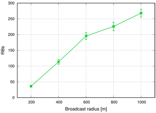 In any case, Figure 30 shows that the reliability of the dissemination is above 99%. Note that in this case vehicles are moving, hence they may enter/leave the target area while a broadcast is ongoing (although this effect is negligible in practice, given the short time it takes for a broadcast to cover the area). To maintain consistency, we count in the delivery ratio only the vehicles that are within the target area at time . Figure 31 shows that the average number of RBs allocated for each broadcast, which is around 280 for a target radius of 1000 m. In this case, too, the number of RBs used is of the same order of the number of UEs, which is quite low.