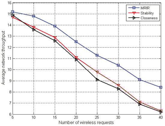 The average throughputs with different numbers of requests are shown in Figure 2. From Figure 2, we can see that the average throughput decreased with the increments of the number of requests for the three algorithms. In the case that network resources were unchanged, this was because the number of wireless requests increased, therefore increasing the probability of link failure. The average throughput of the MRIR was higher than the Route-Stability and Route-Closeness. This was because the MRIR can save network resources based on channel interference and reusability for accepting more wireless requests, which can improve the average throughput for the MRIR. When the wireless request was |∆| = 40, the average throughput of MRIR was 33% and 35% higher than that of the Route-Stability and Route-Closeness.