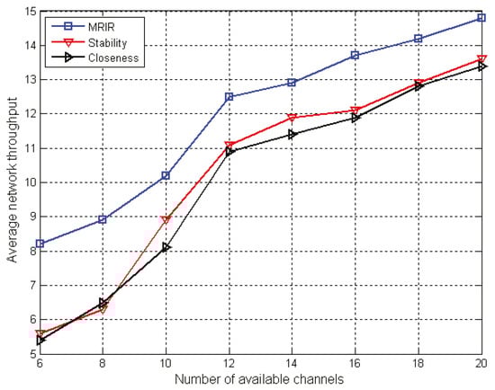 From Figure 3, we can also see that the average throughput increased with the increment of the number of available channels for the three algorithms. This was because the probability of link failure was reduced when the available channel increased. When the number of available channels was |K| = 6, the average throughput of the MRIR was 46% and 51% higher than that of the Route-Stability and Route-Closeness.