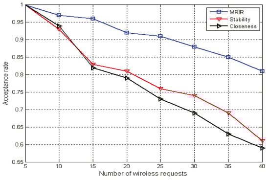 The wireless acceptance ratios with a different number of requests are shown in Figure 4. From Figure 4, we can see that when the number of wireless request was |∆| = 5, the wireless acceptance ratio of the three algorithms was one. This meant that the five wireless requests could be accepted. When the number of wireless requests was larger than five, then the wireless acceptance ration was higher than the other two algorithms because MRIR uses the strategy of interference link reuse, which can effectively save the network resources. With the increase of wireless requests, MRIR’s advantage was more obvious. When the wireless request was |∆| = 40, the wireless acceptance ratios of MRIR were 32% and 37% higher than that of the Route-Stability and Route-Closeness.