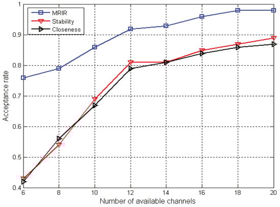 In this section, we present a comprehensive evaluation on the performance of MRIR, Route-Stability [17], and the Route-Closeness [18] algorithm using Matlab R2010a (7.10, MathWorks, Natick, MA, USA, 2010.9). The network topology region size was 2000 m × 2000 m, and TR = 50 m, IR = 100 m. |V| = 60 represents the number of Secondary Users (SUs). Ten primary users (PUs) were randomly distributed in the area. The PUs randomly occupied and accessed the authorized channel. If the PUs needed to access the authorization channel again, then the SUs needed to quit the use of the authorized channel, which led to the failure of the wireless link to the SUs. In this simulation, the time and duration of the access channel of each PU node were randomly generated. The available channel number was |K| = 12, and the bandwidth of each channel was randomly generated in the range of 0–50 Mbps. The wireless request demand bandwidth bp was also randomly generated in the range of 0–20 Mbps. The wireless requests randomly arrived and departed. In a duration time of 1800 s, the arrival wireless request was |∆| = 20. The following simulation results were the mean of 200 independent simulation results. The simulation was mainly based on the number of wireless requests, the number of available channels as parameters, the analysis and comparison of the average throughput, and the wireless request acceptance rate.