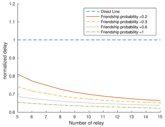 Normalized delay with respect to the number of relays varying the friendship probability; and .