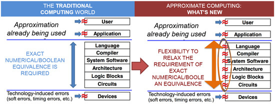 Broadly speaking, approximate computing leverages the capability of many computing systems and applications to tolerate some loss of quality and optimality by trading off “precision” for “efficiency” (where efficiency can be in the terms of increased performance or reduced costs in terms of energy consumed or system cost/area). Approximate computing systems are able to optimize the efficiency of systems by relaxing the commonly applied notion of exact (numerical or Boolean) equivalence between the specification and implementation at multiple layers of the hardware and software stacks (see Figure 1 for a depiction). The use of approximate computing is motivated by the following factors: (1) modern “big data” applications are based on noisy real-world data; (2) many computing applications (e.g., recommendation and web search) do not have a single golden answer; (3) the perceptual limitations of users mean that some approximations may not even be noticed; and (4) many applications exist—e.g., images, video, and sound—where minor errors and approximations can be tolerated by different users. Some recent case studies for applying approximate computing to video processing [7], signal processing [8] and communication systems [9] have shown early feasibility. The research in the field of approximate computing has been led by seminal contributions from the industry players such as Intel [10], IBM [11,12], and Microsoft [13], as well as several research groups from academia [5,6,14,15,16].