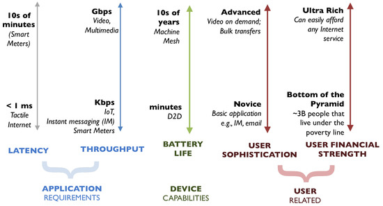 Researchers have demonstrated that 5G has a rich design space with many potential trade-offs [60], such as deployment efficiency vs. energy efficiency; spectrum efficiency vs. energy efficiency; bandwidth vs. power; and latency vs. power. A comparison of parameters for the various 5G use cases are shown in Figure 10. Mainstream 5G research has taken up the challenge of providing high-quality 5G service with gusto, but such an approach will result in an over-engineered system that will be too expensive to install and maintain for low-income and/or rural areas. By suitably scaling the level of service, 5G can encompass a broader coverage base. As an example, the requirement for supporting high-definition (HD) video and tactile Internet may be dropped in low-income scenarios but may be supported for urban and high-income rural environments. Since the rural users would likely prefer “good-enough” service to no service, researchers can explore using the traditional 5G trade-offs in conjunction with the newly developed flexibility of approximate computing and approximate networking to produce cost effective solutions for low-income and/or rural areas.