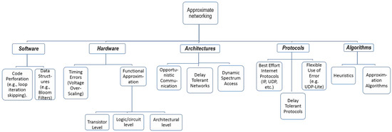 With physical limits beginning to stall the exponential growth of electronics, due to Moore’s law and the Dennard’s scaling, it seems to be the case that future hardware devices, and by extension future network switches and routers, will use approximate computing in one way or another. In terms of hardware support, networking in most end user devices (such as smartphones, tablets, laptops, and embedded devices such as smart TV) is implemented using application-specific integrated circuits (ASICs). These end-nodes are general purpose computing devices that have network-interface-cards (NICs) built in for connecting to networks. In contrast, we also have specialized networking devices (such as routers, switches, hubs, and firewalls) that function as the building blocks of networks; such devices have, in addition to NICs, also switching fabrics and use various techniques such as memory-based computing through ternary-content-addressable-memories (TCAMs). Networking devices also utilize a number of components: memory hierarchy of static RAM (SRAM), dynamic RAM (DRAM), non-volatile RAM (NVRAM), hardware parallelism (using ternary content addressable memory (TCAM)), multiplexers and demultiplexers, and counters, which are all amenable to approximate computing (as explained in [28]).