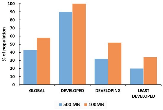 Percentage of population who can afford 500 MB and 100 MB pre-paid mobile data per month [58].
