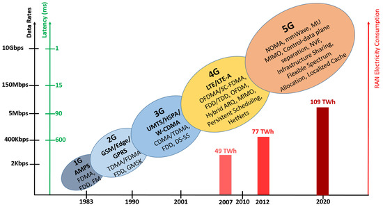 A timeline of historical evolution of cellular networks and the expected electricity consumption of Radio Access Network(RAN) [62].