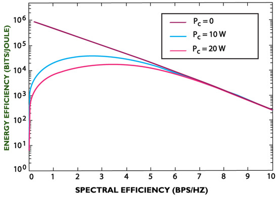 Spectral energy vs. energy efficiency trade-offs for different circuit powers (Adapted from [63]).