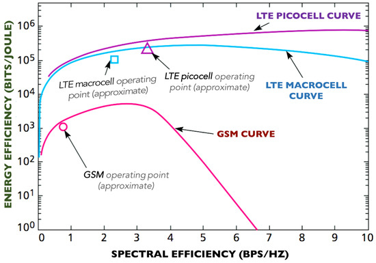 Researchers are actively sketching out the details of the technologies that will drive the future 5G wireless networks. The unprecedented performance requirements of 5G will drive an increase in the overall energy consumption of cellular networks and in its carbon footprints. The evolution of cellular networks over its various generations, and the massive increase in performance as well as energy consumed by cellular Radio Access Networks (RANs) over time can be seen clearly in Figure 7. Satisfying these exacting requirements requires (1) greater spectrum efficiency, which may be defined as the number of bits transferred per second per hertz or b/s/Hz, as well as (2) better energy efficiency, which refers to the energy consumed to communicate an information bit measured in Joules/bit. The spectral efficiency (SE) and energy efficiency (EE) of wireless networks has been well studied in literature [59,60]. Unfortunately, there is a trade-off between higher spectral efficiency and higher energy efficiency, which may be expressed by the following equation for the case of an Additive White Gaussian Noise (AWGN) Channel: