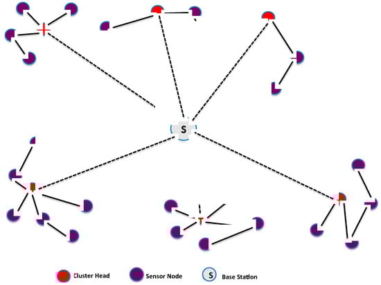 Once the set covers (clusters) are constructed, some sensor nodes become cluster heads (CHs) and collect all traffic from their respective cluster. The cluster head aggregates the collected data and then sends it to the base station as shown in Figure 3. The CH is chosen based on the highest residual energy, thus allowing the network lifetime to increase in proportion to node density [43].