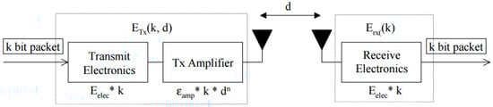 The energy consumption model adopted in this paper is based on the proposed model in [44] which has been used by many researchers [45,46,47,48,49,50]. In this model, it is assumed that the transmitter, power amplifier, and receiver all dissipate energy to run the radio electronics as shown in Figure 4.