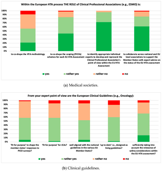 To collect insights on the views of stakeholders regarding the role of medical societies in EU HTA in general as well as on specific aspects of this role, a semi-quantitative research survey was developed, comprising multiple-choice, ranking, and free-text questions (Supplementary Figure S1). For ranking questions, an ordinal Likert response scale (response options: “yes”, “rather yes”, “rather no”, “no”) was utilised for ranking individual items. In addition, free-text questions allowed participants to provide further details and reasoning for their responses. To refine the draft questionnaire, an iterative Delphi process was utilised, conducting two cycles of review by the EAA Faculty in a modified methodology without formal ranking and scoring of the review panel’s responses [21]. The panel consisted of experts from several European countries (Belgium, France, Germany, Italy, Spain, Switzerland, the United Kingdom, and The Netherlands) and institutional backgrounds, including clinicians, patients’ representatives, regulatory authorities, HTA bodies, academia, and HTDs. The survey’s item pool design, validation, and finalization were based on previous EAA practice [3,4,22].