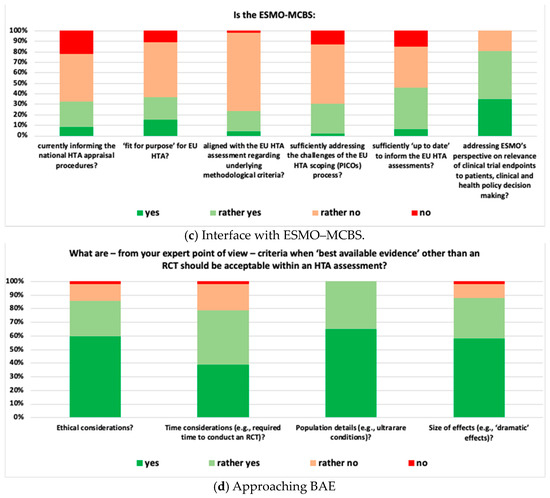 A total of 57 experts representing 15 countries and a wide variety of stakeholders (patients, clinicians, regulators, HTDs, HTA bodies, payers, and academia) provided both qualitative and quantitative responses to the pre-convention survey. Responses from key stakeholder groups included: patients’ representatives (n = 2), clinician’s representatives (n = 10), regulators (n = 3), payers (n = 6), and academia (n = 4). Ten respondents did not provide information on which stakeholder group they represented (Supplementary Figure S2a). Moreover, the responses were provided by national, EU-wide, or global representatives and included the following: Global (n = 10), European level (n = 9), Australia (n = 1), Belgium (n = 2); Croatia (n = 1), Egypt (n = 1), France (n = 3), Germany (n = 7), Greece (n = 1), Italy (n = 5), The Netherlands (n = 3); Portugal (n = 2), South Africa (n = 1), Spain (n = 3), Switzerland (n = 4), United Kingdom (n = 3), and United States of America (n = 1) (Supplementary Figure S2b). The outcomes for the four topics are displayed in Figure 2: Medical Societies (Figure 2a), Clinical Guidelines (Figure 2b), Interface with ESMO-MCBS (Figure 2c) and Approaching BAE (Figure 2d). When dichotomizing the findings into yes/rather yes and no/rather no, the highest and lowest-ranked items were as follows: