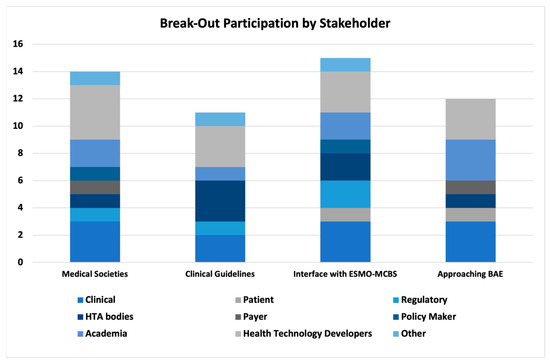 The break-out sessions were attended by 14 (WG 1, Medical Societies), 11 (WG 2, Clinical Guidelines), 15 (WG 3, Interface with ESMO-MCBS), and 12 (WG 4, Approaching BAE) experts. A variety of national backgrounds (Belgium, France, Germany, Greece, Italy, Malta, The Netherlands, Portugal, Romania, Serbia, Spain, Sweden, Switzerland, and the UK) and stakeholder profiles (Figure 3) were included. Key insights generated for each of the sessions included the following: