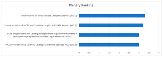 The top priority action point from each of the four break-out sessions, as identified in the final plenary ranking, is displayed in Figure 4. Three of those prioritized action points refer to the role of clinical guidelines in the developing EU HTA process, indicating aligned, and up-to-date clinical guidelines as a key priority to inform EU HTA. Further, ensuring clinical input into the PICO schemes and leveraging insights from regulatory documents as a starting point for the assessment of the totality of available evidence if a development program does not include an RCT were considered top priorities during the final panel scoring.