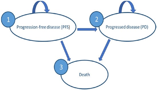 To assess the cost-effectiveness of vemurafenib for patients with BRAF V600-mutated metastatic and/or unresectable melanoma, we developed a probabilistic decision analytic model. The model compares two scenarios: treating all patients with vemurafenib (960 mg (4 × 240 mg tablets) twice daily) versus the status quo (dacarbazine, 300 mg/m2/day for 3 days every 3 weeks). All patients were over 18 years, treatment-naïve, and had BRAF V600 unresectable or metastatic melanoma. Both treatments were continued until disease progression or occurrence of unacceptable toxicity. We created a Markov model using Microsoft Excel 2016® with three mutually exclusive disease-related health states (Figure 1): (1) progression-free survival (PFS), (2) progressed disease (PD), and (3) death. A time horizon of 10 years, with monthly cycles, was chosen after reviewing the input from the identified CEAs and consulting with experts in the field. The analysis was carried out from the perspective of Tunisian public payers (CNAM and public health facilities). Costs and health outcomes were discounted at 5% per year in accordance with INEAS guidelines []. A PFS state was the starting point for the simulated cohort of patients. In each cycle, a proportion of patients could remain at the same health state, another proportion could progress, and another may die, according to transition probabilities. Regression from the PD state to the PFS state was not possible.