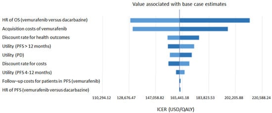 The deterministic sensitivity analysis, illustrated by the Tornado diagram (Figure 2), demonstrated that the most significant parameters influencing the results are the overall survival HR and the acquisition cost of vemurafenib in the two perspectives. Other parameters, such as utilities, patient follow-up costs, or the costs of managing adverse effects, had little impact on the results.