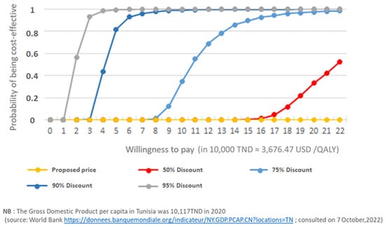 Figure 4 illustrates the probability of the treatment being cost-effective according to the willingness to pay (expressed in 10,000 TND ≈ 3676.47 USD/QALY) for different scenarios of potential discounts on the proposed price. The probability of the product being cost-effective at the proposed price is 0%.