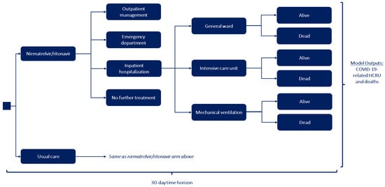 Following treatment initiation, patients were subsequently grouped into one of four medical care categories based on treatment effectiveness associated with NMV/r and usual care. Based on treatment effectiveness, patients were assigned the highest level of care received in the 30-day model time horizon: (1) inpatient hospitalization, (2) emergency department (ED) visit, (3) outpatient follow-up care, or (4) no further treatment.